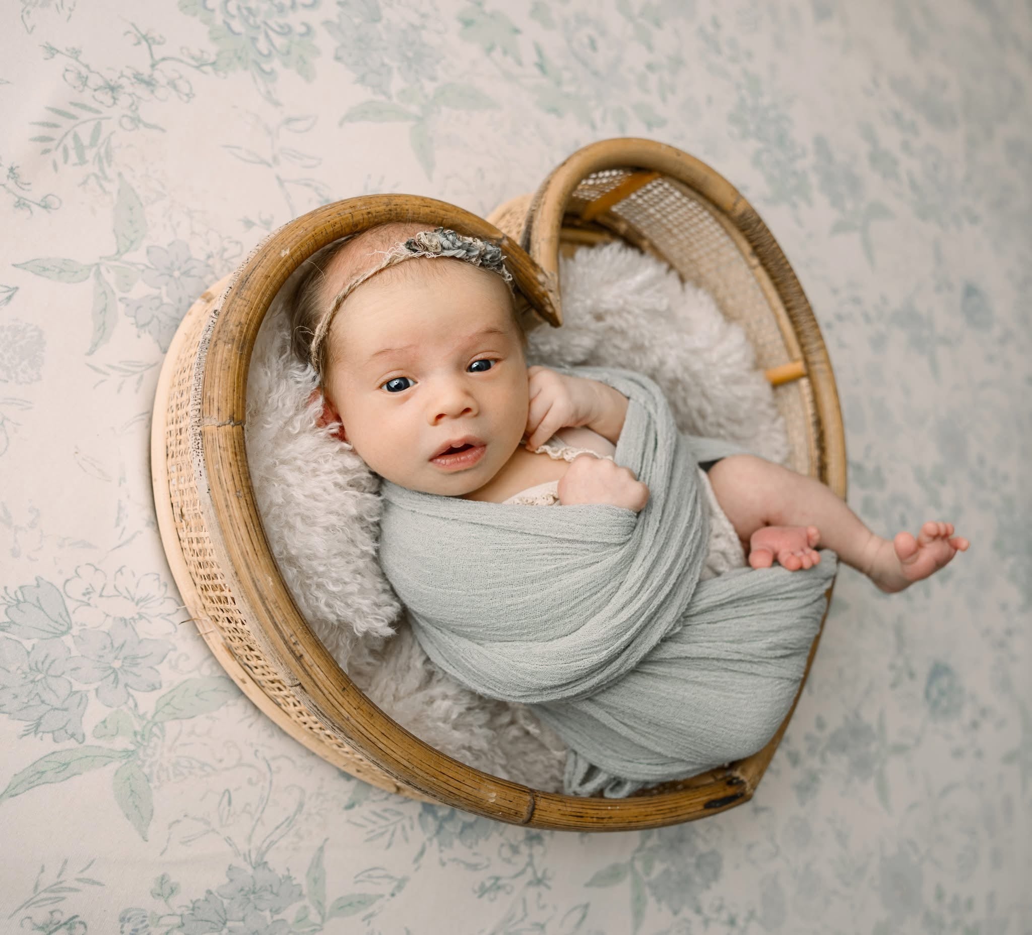 This drop features a blue and green floral design on a cream fabric.